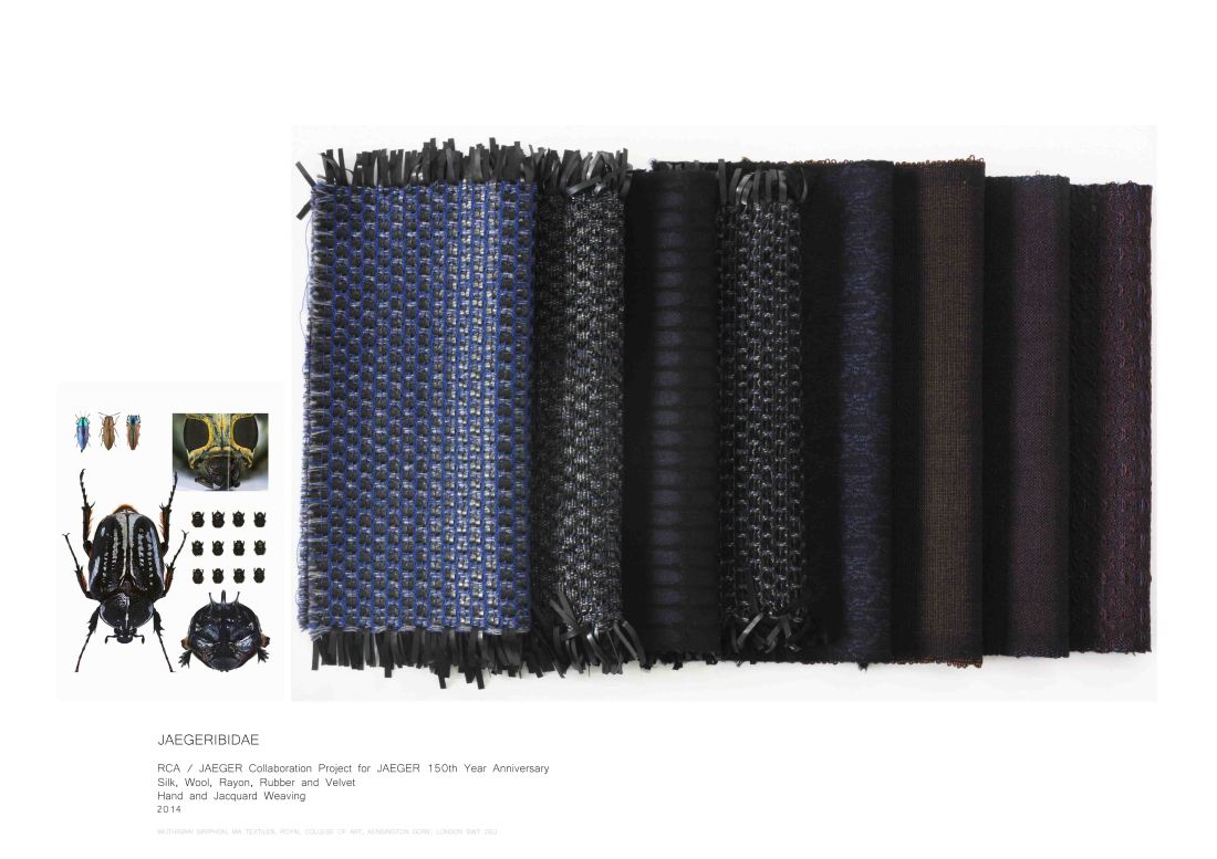 A collection of textiles inspired by the texture and colours of beetle. A collaborative project between the RCA and Jeager.